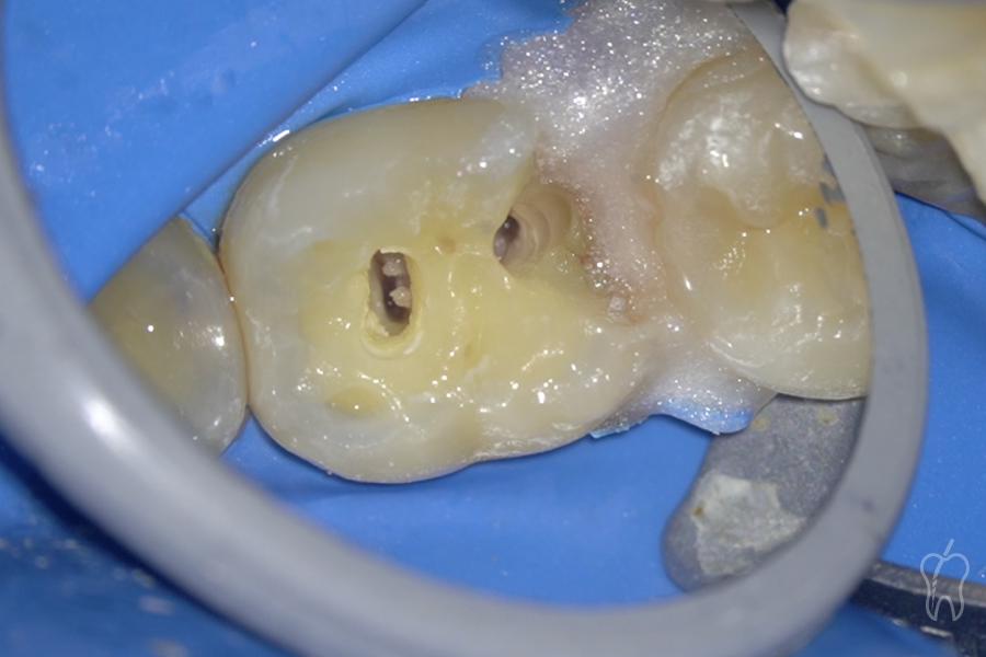 Con la cámara pulpar completamente limpia y manteniendo intacto el puente dentirario generado por el acceso tipo Truss, se procedió a la fase restauradora.