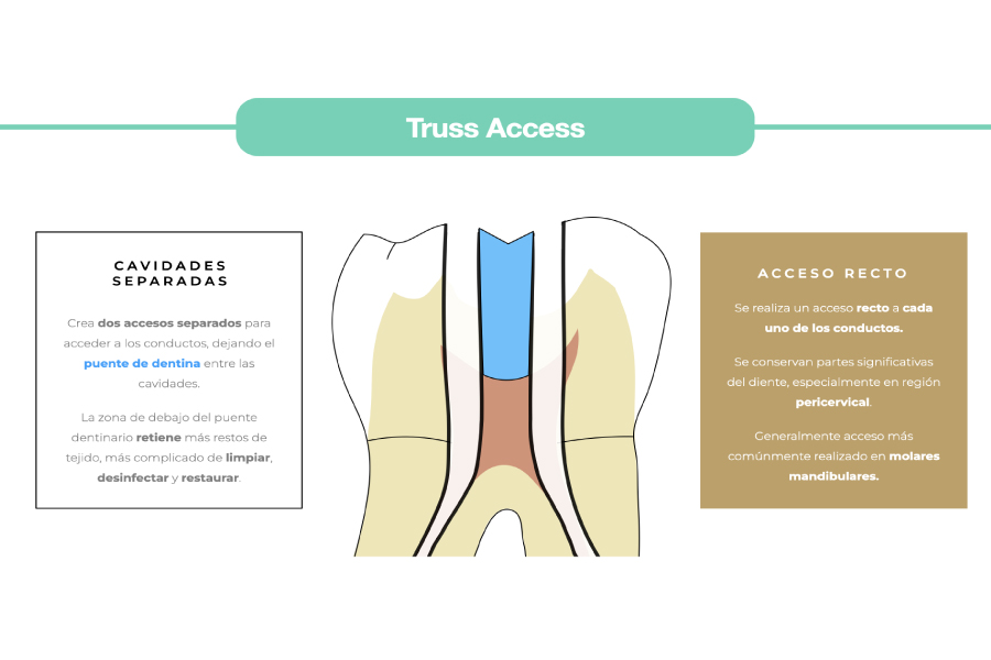En los últimos años, el desarrollo de técnicas de acceso conservador, como el acceso tipo Truss, junto con sistemas de instrumentación más flexibles y respetuosos con la anatomía, han permitido tratar estos dientes minimizando la pérdida de estructura y manteniendo un pronóstico restaurador más favorable.